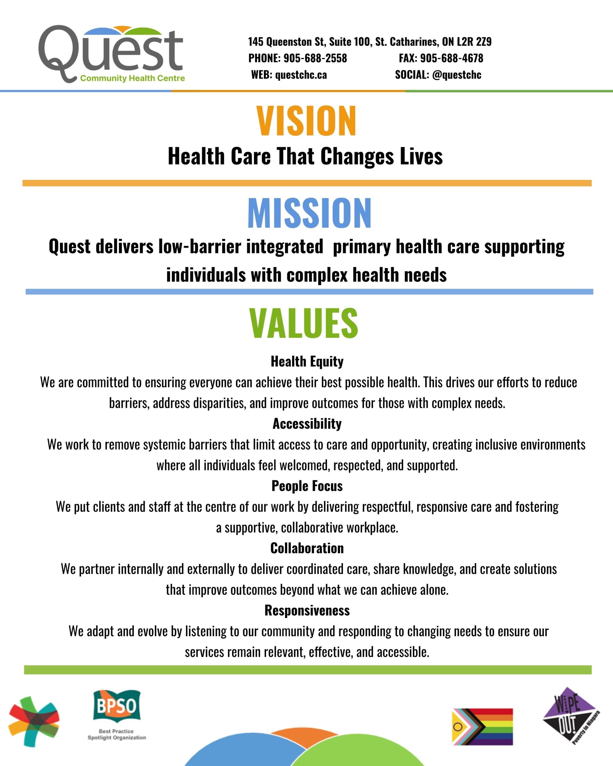 Quest Community Health Centre (Quest CHC) is a non-profit registered charitable organization providing primary health care, health promotion, and community capacity building to residents of the St. Catharines area and Niagara Region.